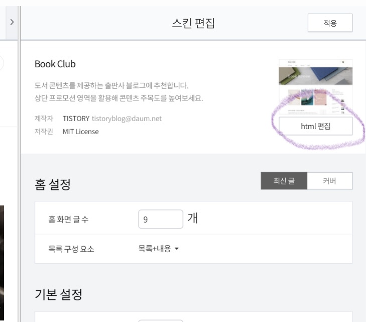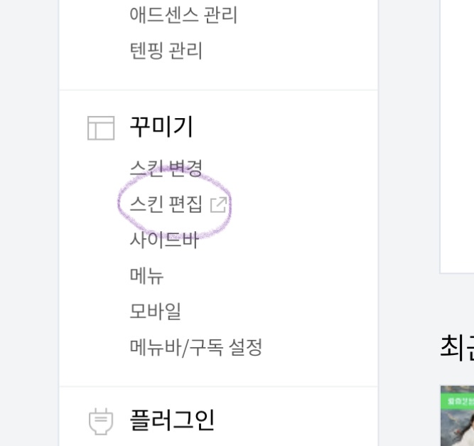 꾸미기에 “스킨 편집”을 클릭하고