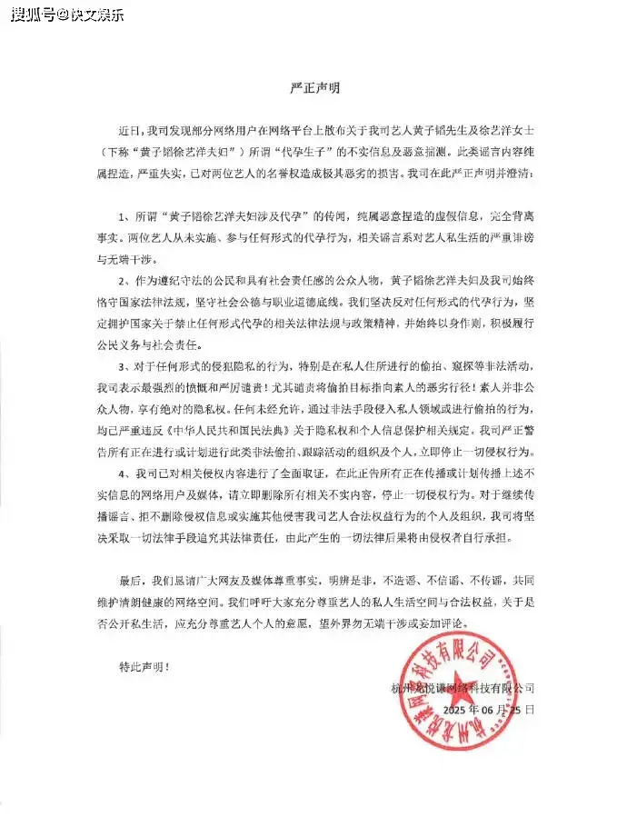 "두 아티스트는 어떠한 형태의 대리 출산 행위도 한 적이 없으며, 관련 루머는 연예인 사생활에 대한 심각한 비방이자 무분별한 간섭입니다"