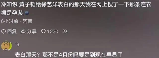 지난해 3월, 가수 황쯔타오가 예능 프로그램에서 공개적으로 서예양 배우에게 청혼을 했고, 서예양 배우는 망으로 된 망토 스타일의 원피스를 입었는데, 그 배 부분이 다소 불룩해 보였다고 하며, 서예양 배우는 자신의 배를 쓰다듬는 동장도 했다고 해요.
