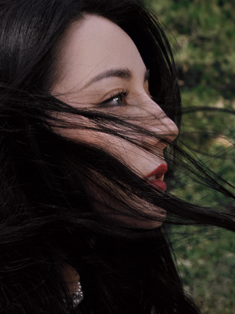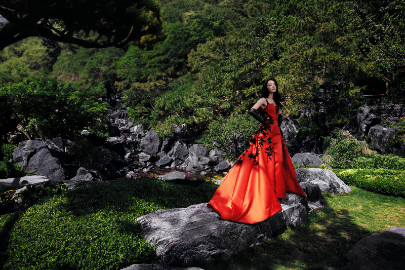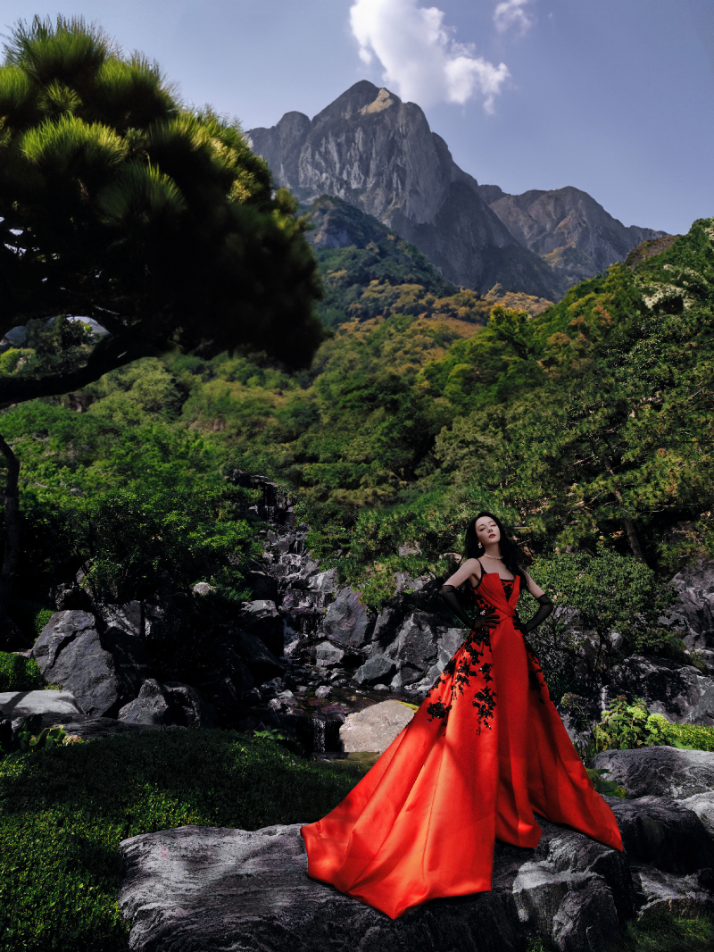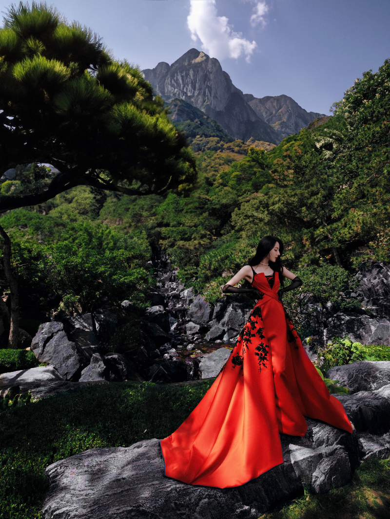산수 아래 붉은 드레스를 입어 고풍스러움을 자아내는 화보인데요,