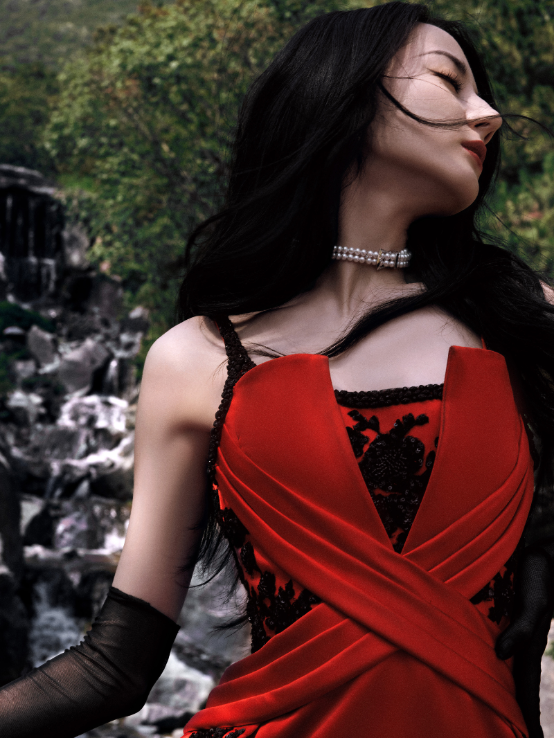 산수 아래 붉은 드레스를 입어 고풍스러움을 자아내는 화보인데요,