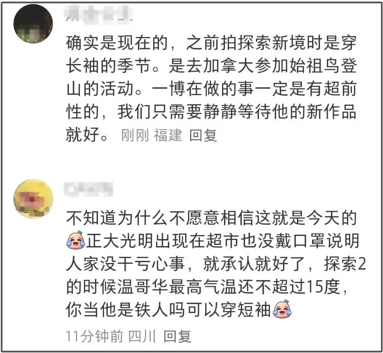 어떤 사람들은 사진은 이미 몇 달 전 촬영된 것이고, 왕이보 배우는 다큐멘터리 작업차 나간 것이라고 주장했고, 또 다른 사람들은 "사진 속에서 반팔을 입고 있는 것을 보니까 최근에 찍힌 사진이 분명하다고 말했다고 하죠.