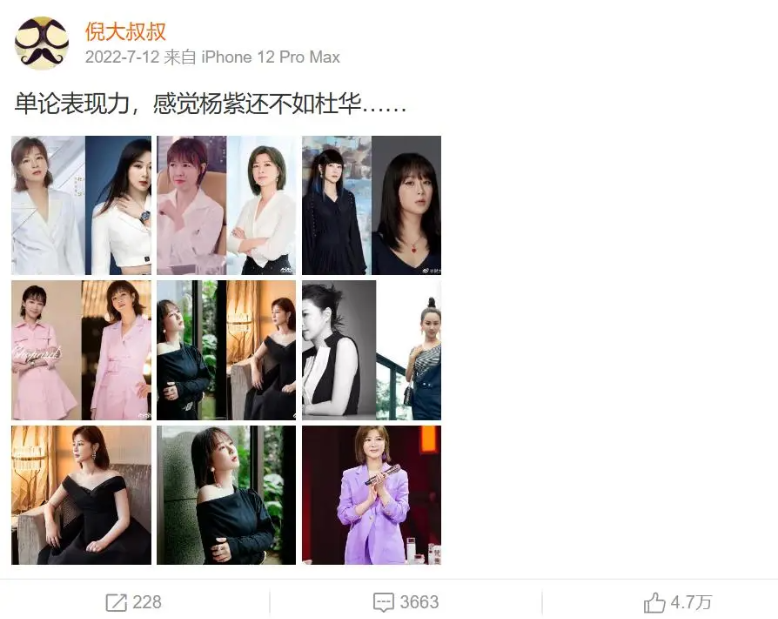새 드라마 "국색방화" 작품에서 얼굴에 깊은 팔자 주름이 있지만 가리지 않고 당당하게 드러냈으며, "웨이보의 밤" 행사에서 당나라 시대 메이크업을 하고 등장했을 때는 더 이상 소녀의 모습이 아닌 다소 노숙해 보였지만 얼굴에는 여전히 자신감이 넘치는 미소를 짓고 있었죠.
