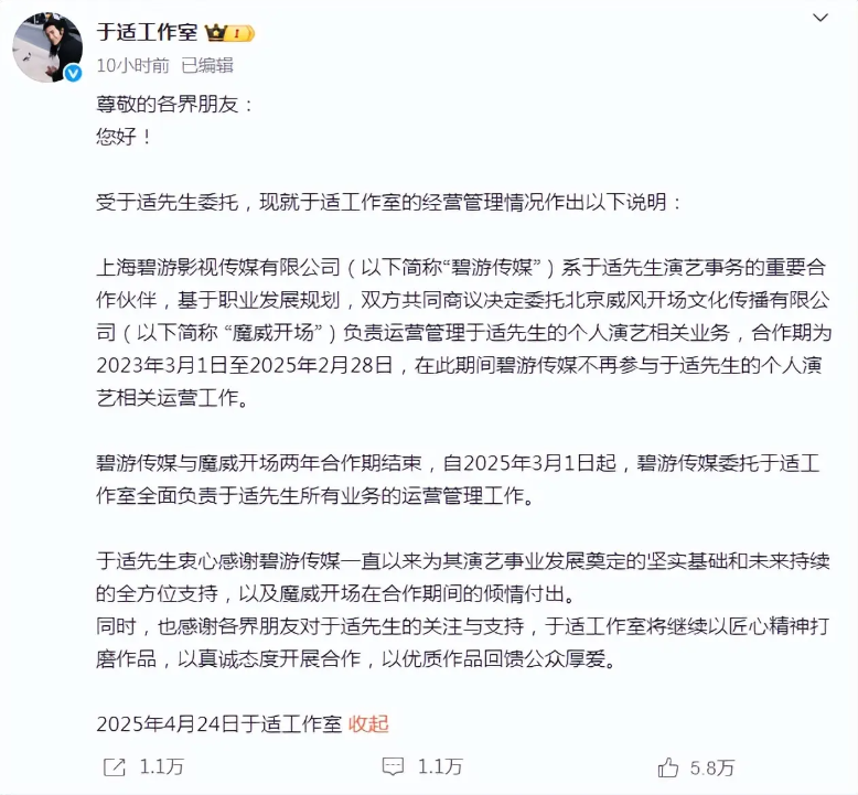 얼마 전, 우적 배우 공작실은 성명문을 발표해서 공작실이 우적 배우의 모든 업무 운영과 관리를 전적으로 책임질 것이라고 선언했다고 해요.