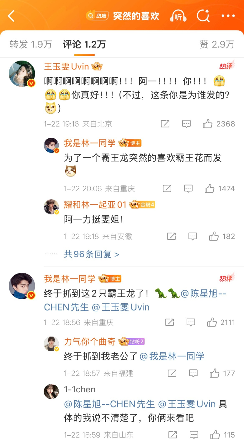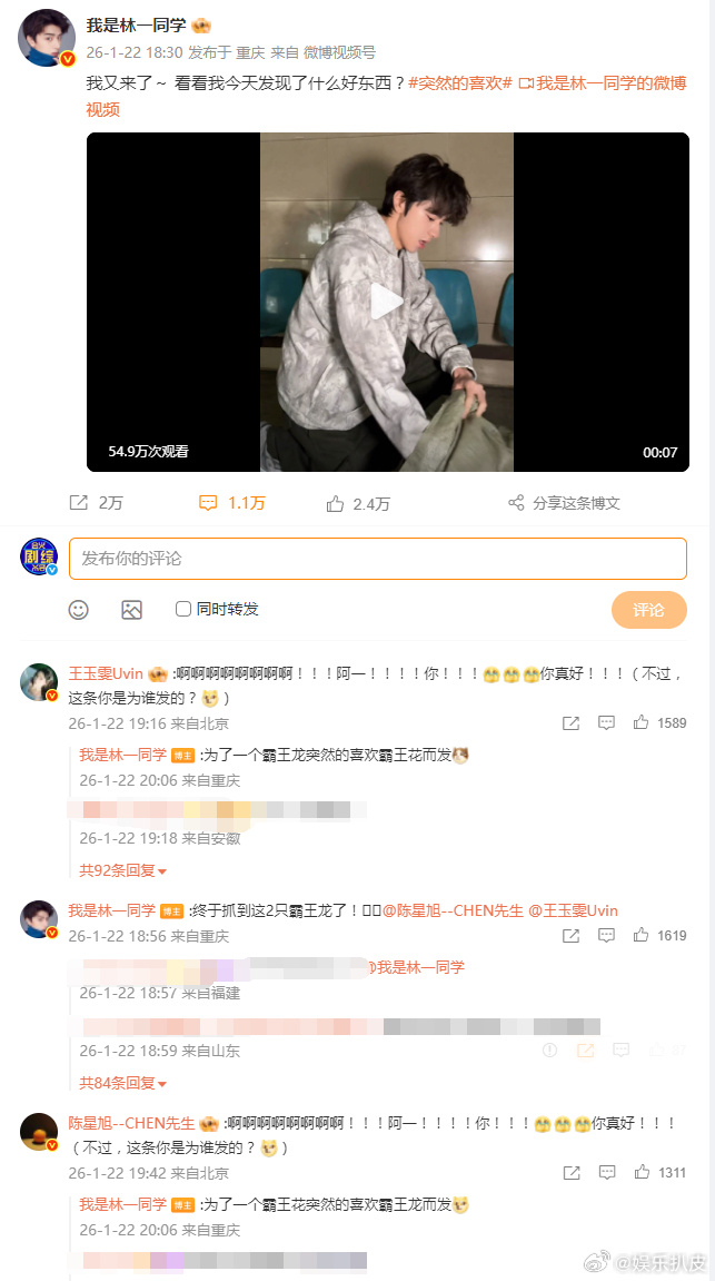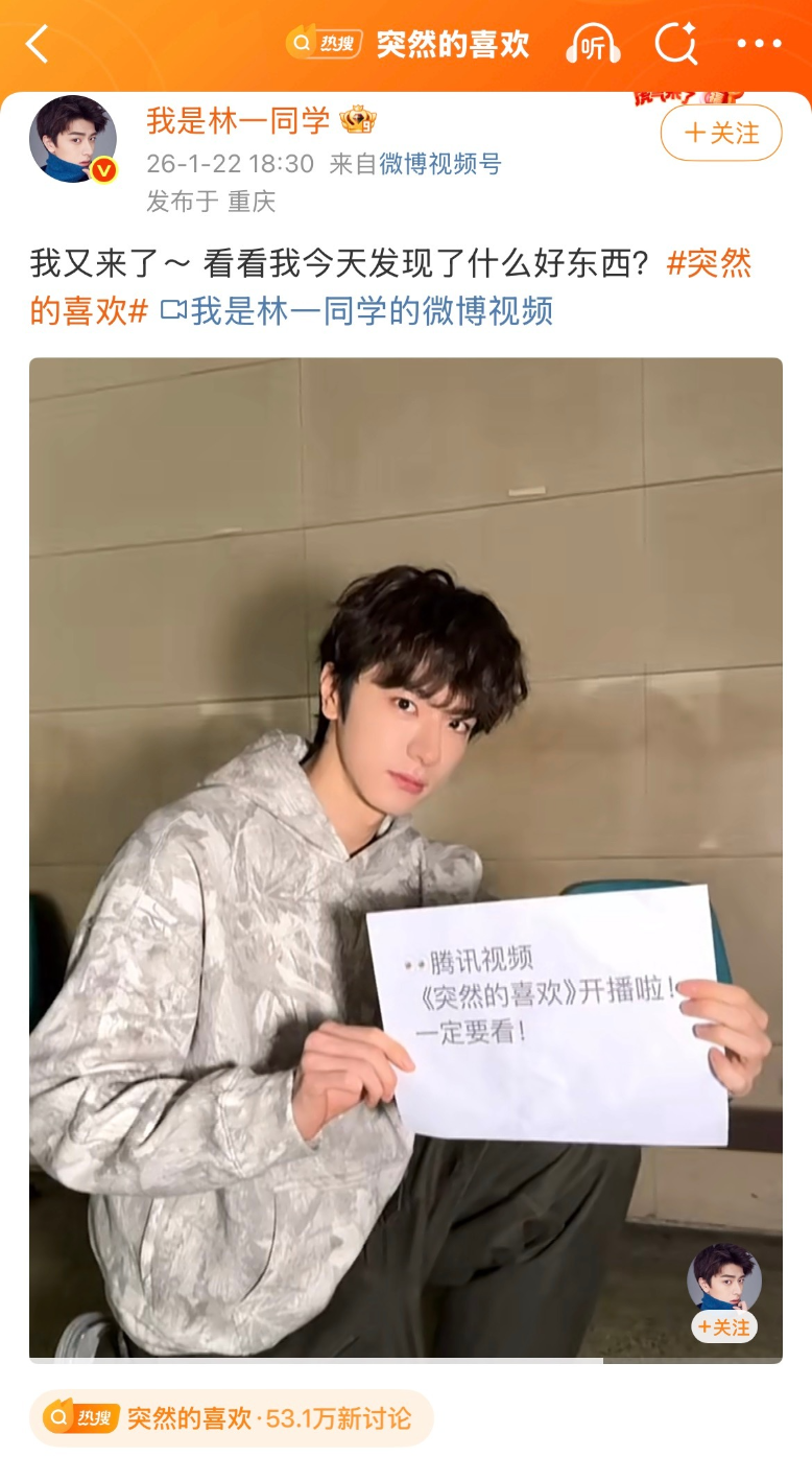 최근 임일 배우가 숏폼 영상을 하나 게시하면서 절친인 진성욱 배우와 왕옥문 배우의 새 드라마 《돌연적희환 突然的喜欢》 작품의 기를 살려주었다고 해요.