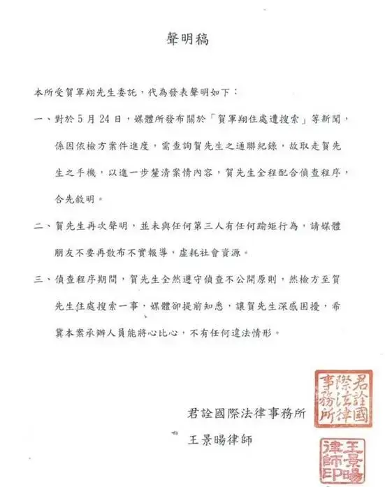 이후 타이베이 검찰청도 이 사실을 확인하고 경찰이 압수수색영장을 가지고 난 뒤 수색 작업에 나섰고 하군상 배우의 휴대전화와 기타 관련 증거 자료물들을 압수 했다고 밝혔어요.