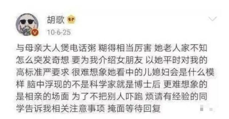 호가 배우는 자신의 결혼에 대해서 어머니가 '거부권'을 가지고 있음을 드러내며 앞서 자신의 게시물에서 어머니의 며느리 선택 기준이 매우 까다롭다고 토로한 적이 있었는데, 과학자이거나 박사, 연구원이기 때문에 이러한 한정된 요구 사항으로 인해 호가 배우는 머리를 아파했다고 해요.