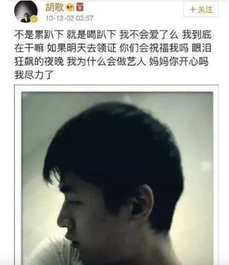 그리고 호가 배우의 최근에 노출된 사진들로 판단해 보면 그는 고작 1982년생인데 벌써 머리가 백발이 되고 매우 초췌해 보이며 고민이 정말 많았다는 게 느껴질 정도였다고 하는데, 밤늦게 글을 올리며 우울증이 재발한 것으로 의심이 되기도 했죠..!