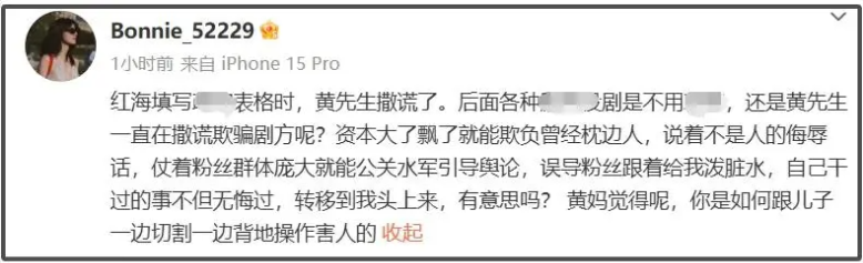 더 나아가서 황징위 배우와 그의 어머니가 톱스타를 달래서 아이를 낳도록 했다는 폭탄 발언까지 내놨는데요.