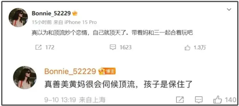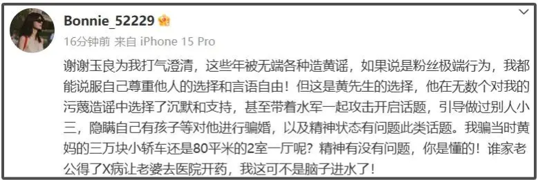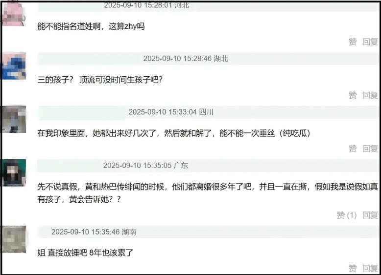 그녀의 주장에 따르면, 톱스타가 실제로 아이를 가졌고, 황징위 배우는 그 와중에도 바람을 피웠으며, 황징위 배우의 어머니가 톱스타를 달래서 아이를 낳게 했고 결국 두 사람은 결별했다는 것이었죠..ㄷㄷ