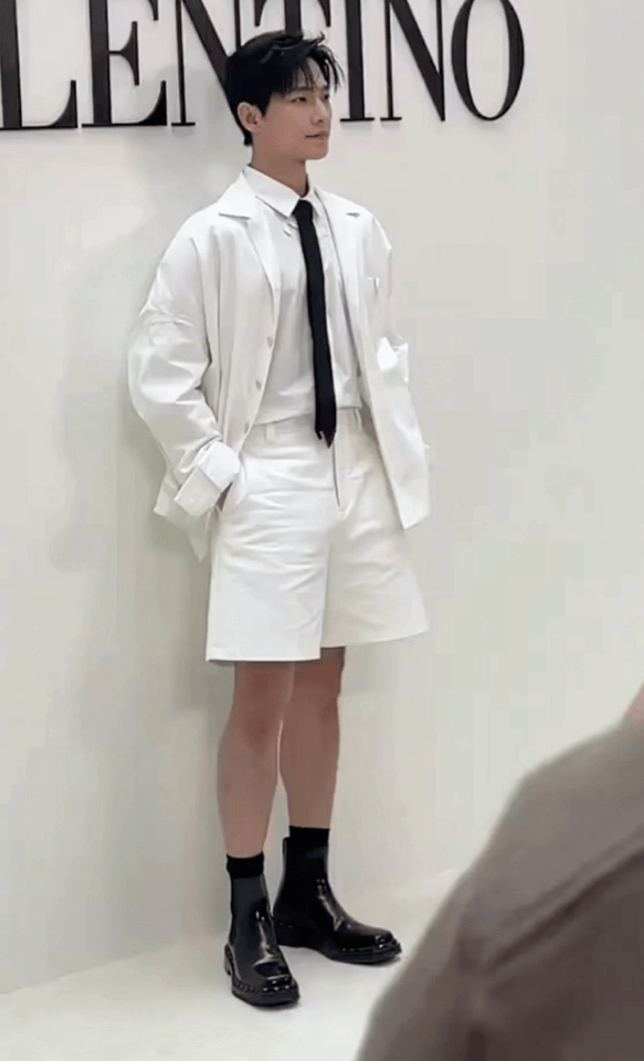 위 아래 화이트 패션으로 반바지에 검은색 양말과 앵글부츠가 인상적이네요.