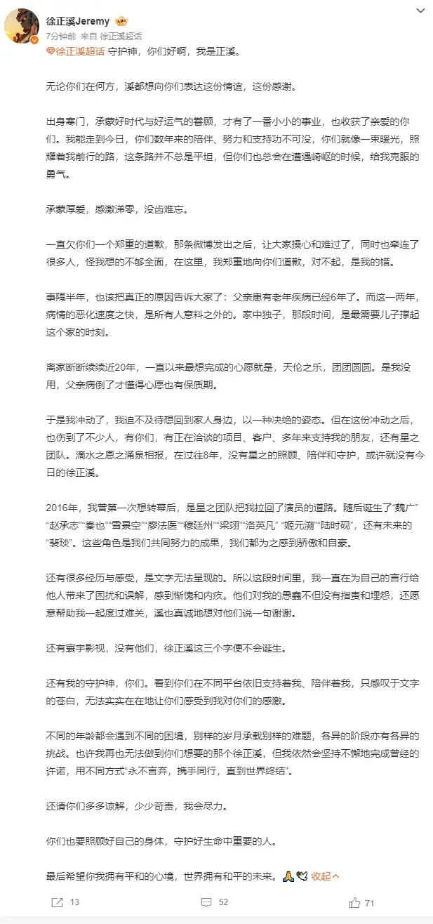 제가 예전에 웨이보에 올린 글 때문에 많은 분들께 걱정과 속상함을 드렸고, 또 다른 분들께도 피해를 끼쳤습니다.