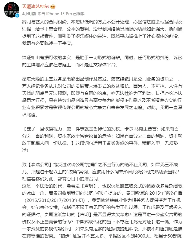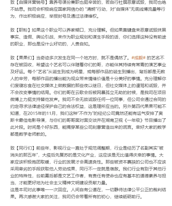 이 글에서 천희엔터는 "환서컴퍼니"의 "캐스팅" 부분을 고발하며 성의 배우가 계약을 해지한 이후에도 자신들이 여전히 성의 배우에게 많은 작품거리를 마련해주었다고 주장했고, 신지뢰(신즈레이, 辛芷蕾, Xin Zhilei)는 데뷔 전 재능이 없었지만 연예계 기회를 제공했다고 주장했죠.