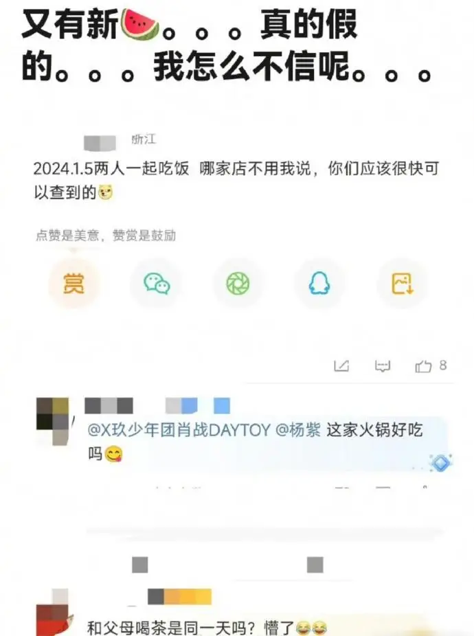 일부 네티즌들은 1월 5일 양쯔 배우와 샤오잔 배우가 함께 전골을 먹었다고 폭로했으며,