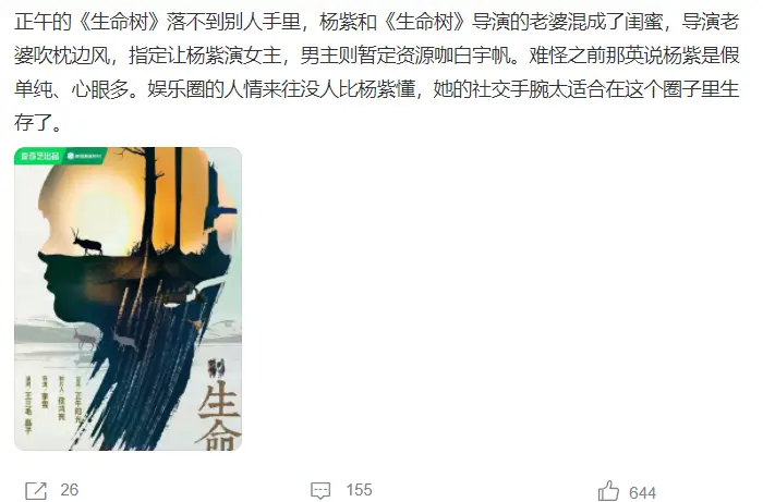 배우 "양쯔", 드라마 《생명수 生命树》 작품의 여주인공으로 낙점 가능성 높아, 파트너는 아직 미정..!