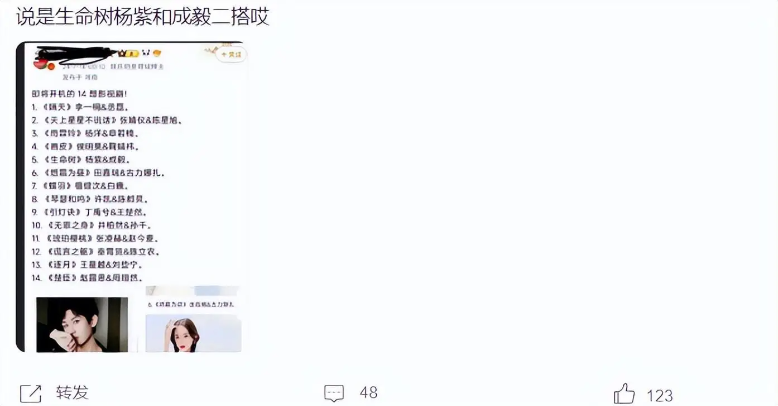 온라인상에서 떠도는 소식들에 따르면 양쯔 배우는 현재 《생명수 生命树》 작품 출연을 긍정적으로 검토하고 있는 상황이라 이 작품에 출연할 확률이 높다고 하는데, 상대 남자 주인공 역할이 원래 거론되고 있었던 백우 배우가 아니라 다른 배우와 함께 출연할 가능성이 높다고 해요~!