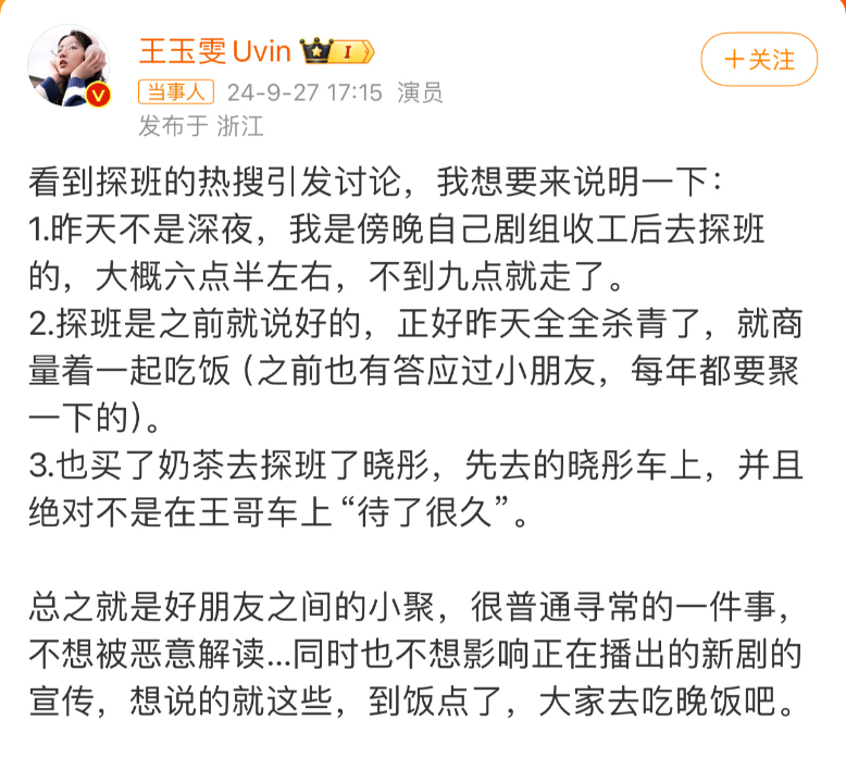 이에 논란이 커지자 왕옥문 직접을 해명하며 이번 촬영장 방문에 대해서는 미리 사전에 약속된 부분이었으며, 저녁에 가서 밤 9시쯤 떠났다고 밝혔다고 하죠..;;