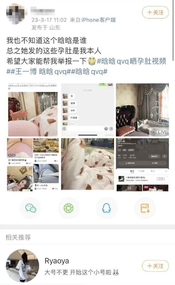 정확히 무슨 일이 있었던 건지는 모르겠지만 2023년 아이디 'hanhanqvq'이라는 한 네티즌이 임신한 배를 찍은 사진을 올리며 왕이보 배우의 아이를 임신했다고 폭로를 했어요.