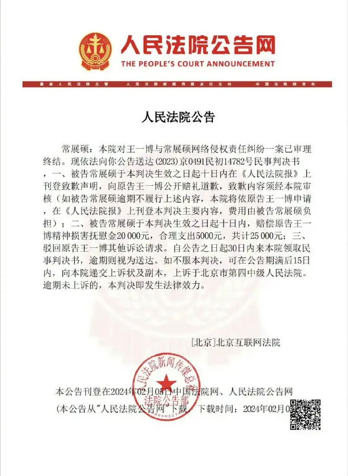 2월 5일 밤, 왕이보 배우는 마침대 사생팬을 상대로 소송에서 승소했고, ' 'hanhanqvq' ' 는 25000위안을 배상하게 되었다고 하죠..!