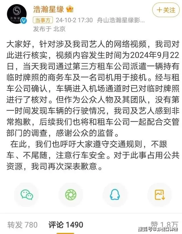 10월 2일 저녁, 전희미 배우의 소속사인 '호한성연 浩瀚星缘'은 장문의 입장문을 발표하며, 해당 차량이 무면허 차량이 아니라 임시 번호판을 부착한 차량이었고, 운전 경로는 전적으로 운전자가 결정한 것이었으며, 전희미 배우와는 전혀 무관하다고 해명했다고 해요.