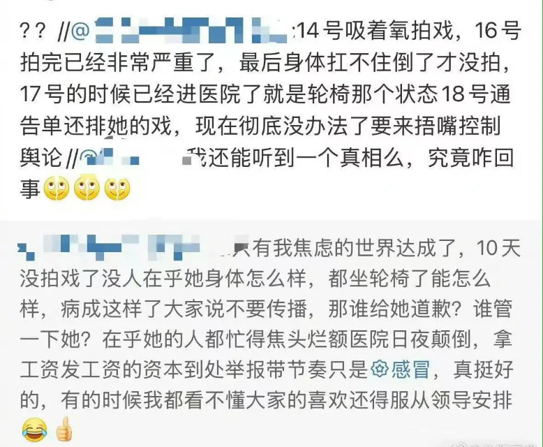 네티즌들은 조로사 배우가 12월 14일, 촬영을 위해 산호 호흡기를 사용했고, 16일 촬영 이후에는 상태가 매우 심각해져서 결국 몸상태를 견디지 못하고 쓰러졌다고 폭로했다는데요.