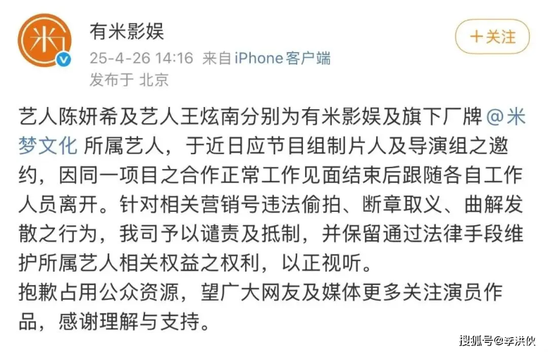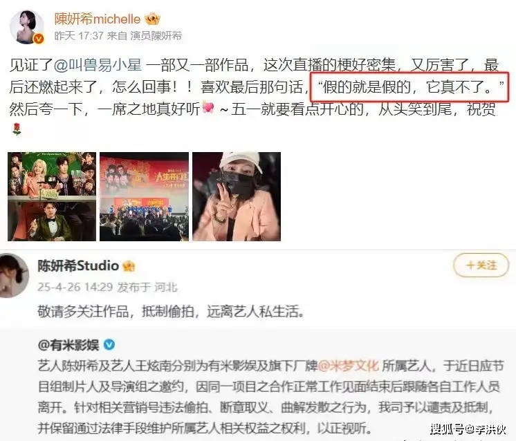 친구 이샤오싱 易小星 감독의 영화 《일석지지 一席之地》 작품 홍보와 함께 "진실은 영원히 거짓이 될 수 없고, 거짓은 영원히 진실이 될 수 없다"라는 말로 현재의 근거 없는 소문을 일축했다고 하죠.