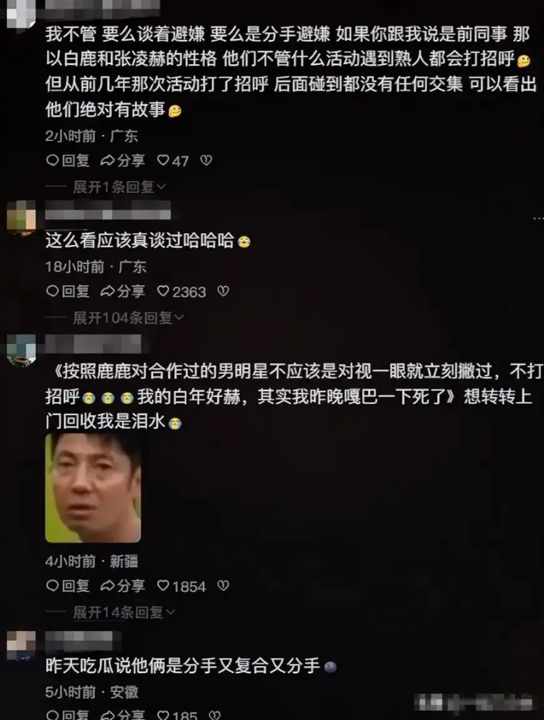 이제 두 사람이 함께 있는 자리에서 '눈을 흘기는' 드라마틱한 장면이 연출되자 백록 배우의 냉담한 태도와 소속사의 싱글 선언문은 외부로 하여금 두 사람의 관계가 이미 완전히 결별한 것이며, 과거의 달달했던 모습은 완전 옛일이 되었다는 추측이 쏟아지고 있다고 하죠.
