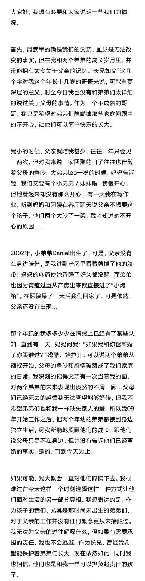 그의 형이 장문의 글을 통해서 가정 문제에 대해서 직접 입장을 밝혔는데, 주가운 배우의 본명은 다이엘이며, 형은 두 형제가 아버지에 대한 기억이 거의 없고 집안에는 늘 다툼이 있었으며 아버지의 부재 속에서 자랐다고 말했죠.