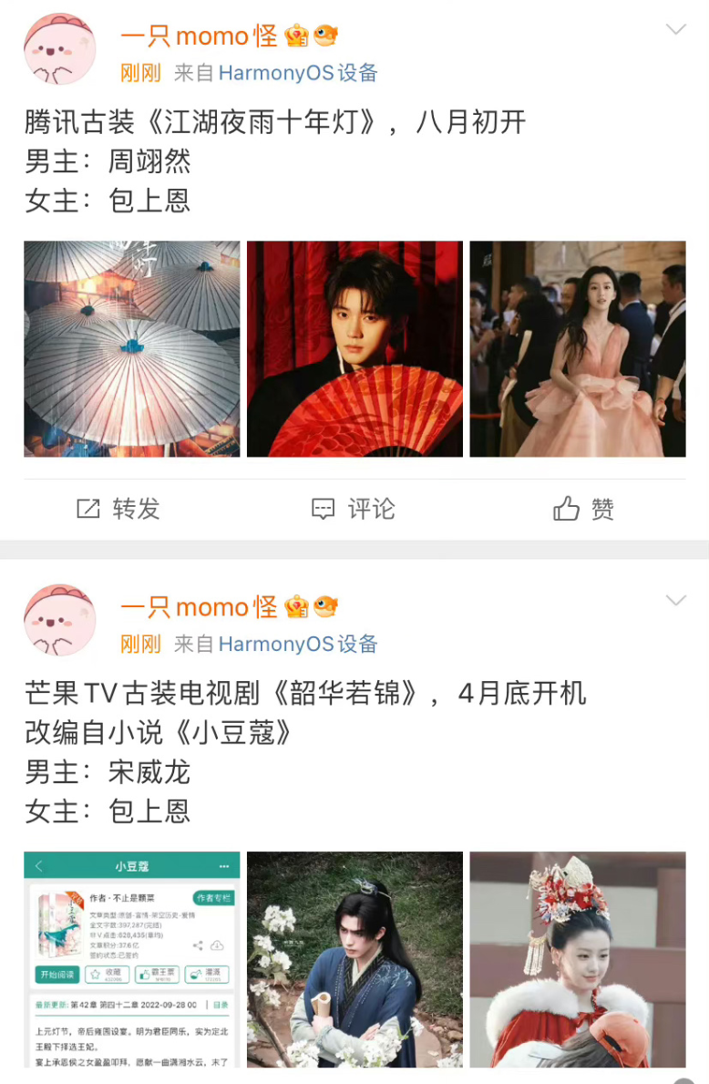 그리고 《강강호야우십년정 江湖夜雨十年灯》은 8월에 크랭크인 예정으로 여자 주인공은 포상은 배우에 남자 주인공은 주익연 배우라고 하죠.