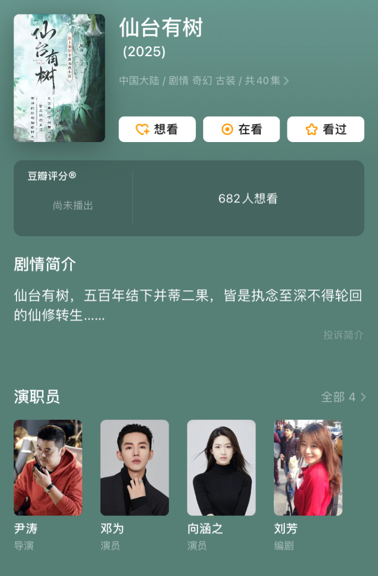선태유수 (仙台有树) 감독 : 윤타오 (Yin Tao) 극본 : 류팡 (Liu Fang) 총 부작 : 40부작 예정 2023년 09월 크랭크인 예상이며 촬영기간 130일. 주연이 남주는 ‘백경정’ 픽스에 여주만 ‘안젤라베이비’